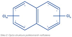 PCN-ovi su klasa spojeva u kojima su atomi vodika zamijenjeni atomima klora u naftalenskom prstenu. Ukupno je identificirano 75 kongenera prema broju i poziciji atoma klora (pozicije 1 do 8), njihova opća formula je C10H8-nCln. Pojedini kongeneri razlikuju se u stupnju kloriranja i fizičko- kemijskim svojstvima. Zbog svoje postojanosti i toksičnosti, PCN-ovi se smatraju značajnim okolišnim zagađivačima.
