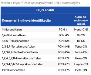 U ALS-u koristimo najmoderniju analitičku metodu zaodređivanjePCN-akojaobuhvaćaodređivanje kloriniranih skupina od monokloronaftalen do oktakloronaftalen i, ako je potrebno, odabrane kogenere (Tablica 1) u otpadnim, tjekućim i čvrstim matricama.